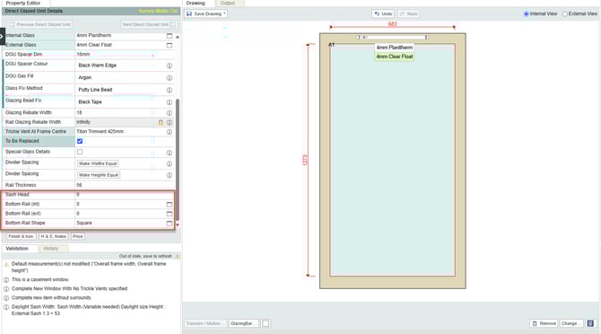 In the properties editor, scroll down to find the properties for sash head and bottom rail.