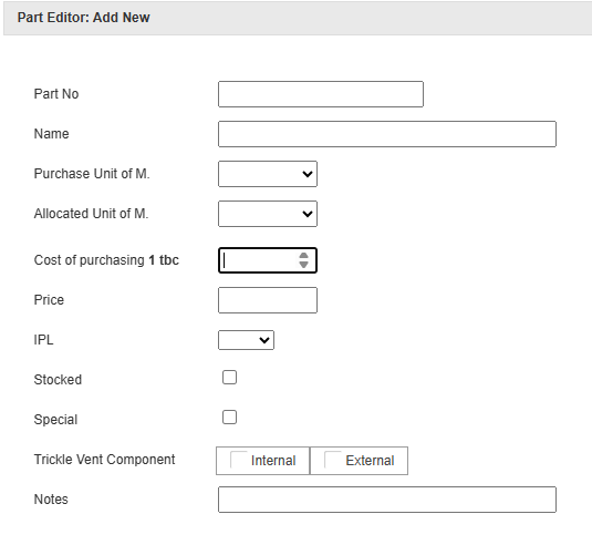 Note: Similar parts with different finishes can be grouped together under a simplified, customer-friendly part name on a single row, for example, 'sash lift' for sash lifts in polished brass, polished chrome, satin chrome, and antique brass. Parts not in the ironmongery lookup can still be added to drawings via the part allocator, but these will not appear on quotes, only on internal outputs.