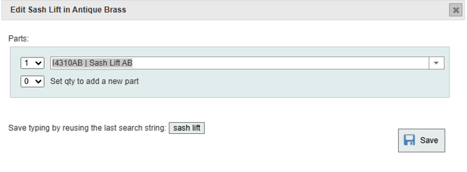 Note: Multiple parts can be added to a single lookup entry, useful when it is preferred for several components to appear under a single name on customer quotes, for example, a multipoint locking system.