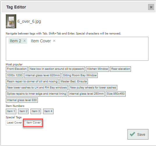 Select the photo for the item cover image. Tag the photo with the correct item number. Next, click item cover to add it as a special tag. Click save.