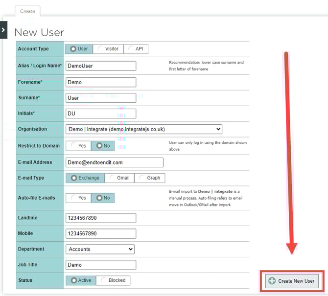 A new user form will be displayed. Complete all the required fields with the new user's information, check details are correct. Click the create new user button to add the new user to the system.