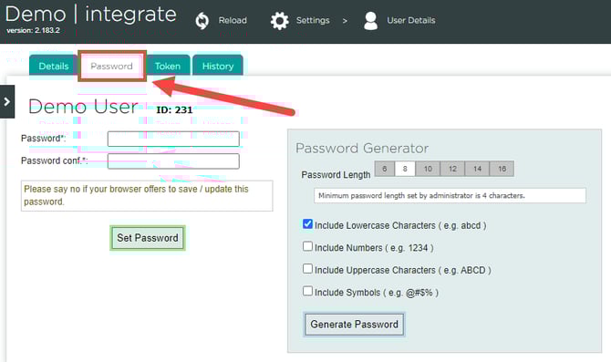 After submitting the form, the page will refresh to display the profile of the newly created user. To set up the user's login credentials, select the password tab, then create a password, manually or using the integrate password generator: