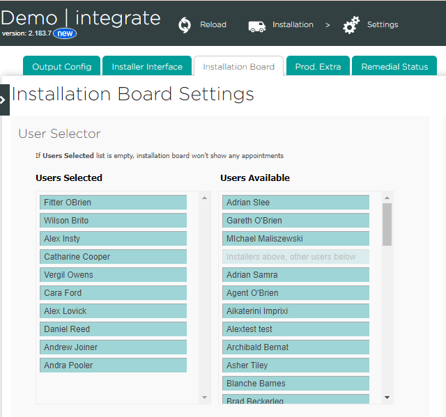 To add users to the installation board, drag users to the users selected column. To remove them, drag to the users available column.
