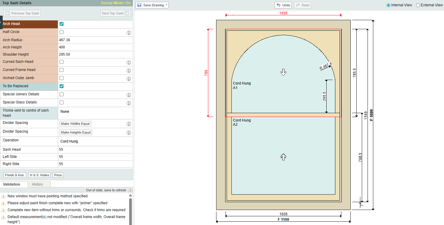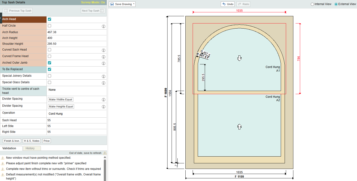 Tick the Arched outer jamb option, This will cause the outer frame to follow the shape of the arch