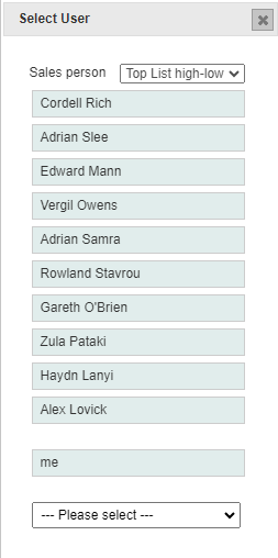 A list of frequently assigned salespeople is displayed. Click a name to select or open the full list of users via the drop-down menu at the bottom.