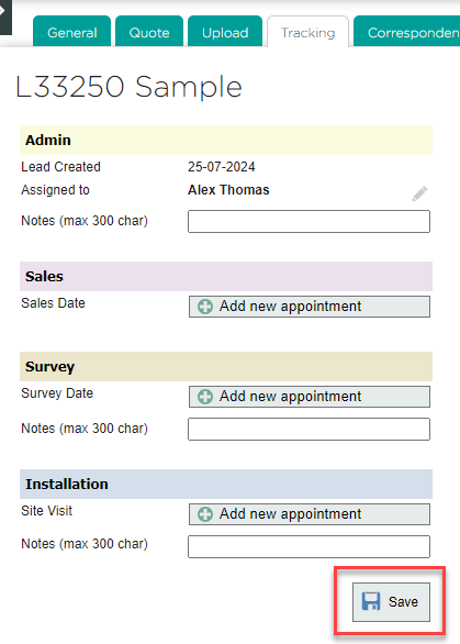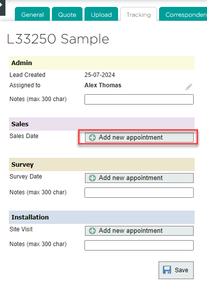 Click add appointment. The appointment will appear in both the lead’s calendar (accessible from the tracking tab) and in the personal calendars of all attendees.