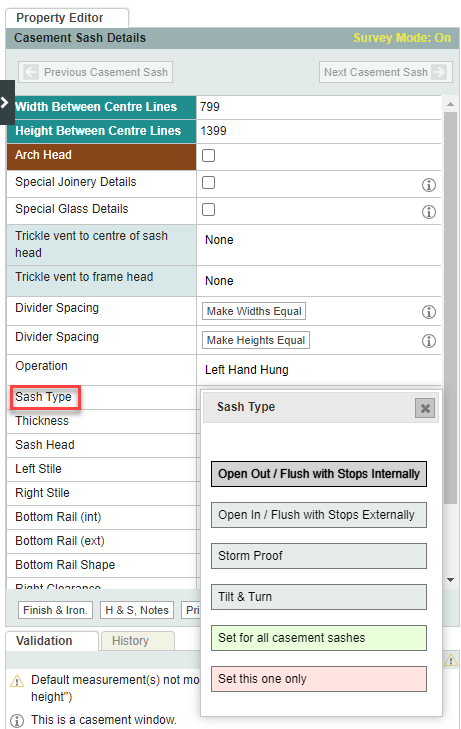 To change whether the sash opens inwards or outwards, or to choose between flush, stormproof or tilt and turn options, select casement sash, then click the required option next to sash type. After choosing an option, apply the change to all casement sashes in the drawing, or to the selected sash only.