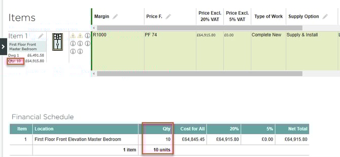Item quantity can also be viewed in the financial summary section of the quote.