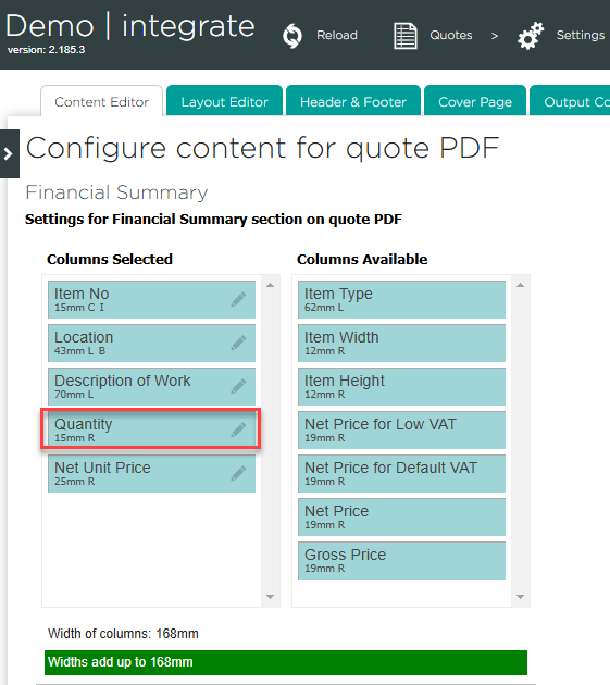 To enable item quantity in the financial summary section, go to quote settings and select the quantity column.
