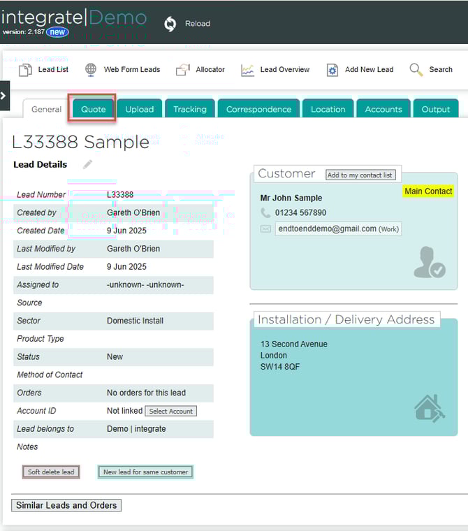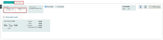 Find the relevant lead, or add a new lead (see 'Creating a New Lead' for guidance). Click the quote tab, and select manage quotes on the right.