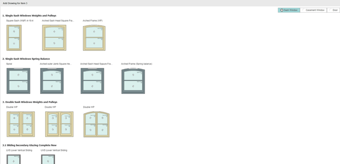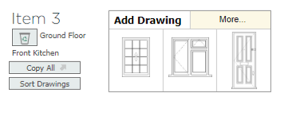 Next to an item, select a window or door. Click the sash window, casement, or door icon. Alternatively, click more to import an existing drawing from another lead or order.