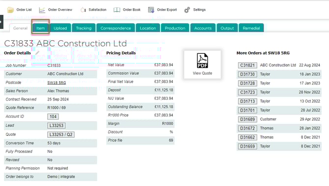 Locate the item tab, click to view a list of sales drawings copied from the quote.