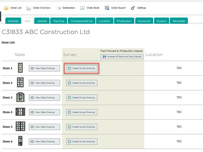 Click create survey drawing next to any item. To generate production output sheets for all items, click process all items and see outputs to copy all sales drawings as survey drawings, and mark as processed by survey.