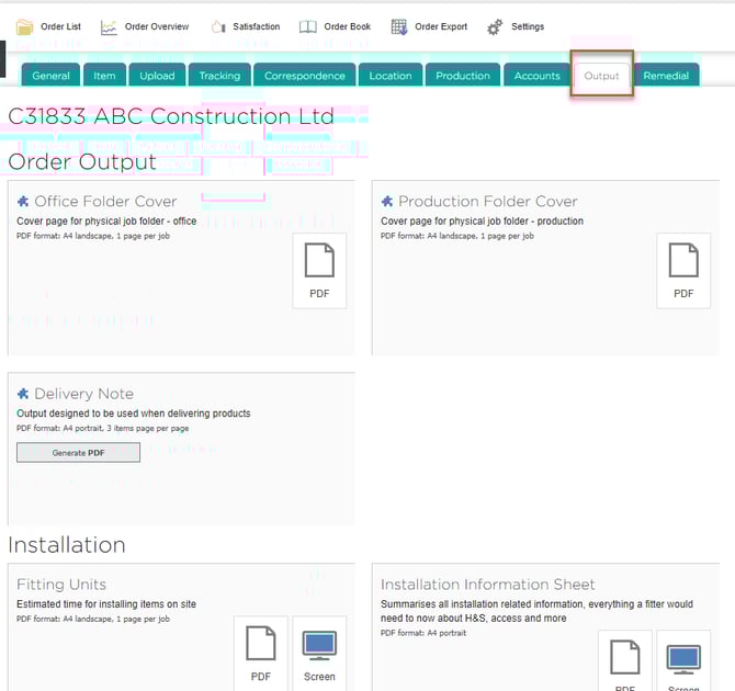 Once a drawing is marked as processed by survey, navigate to the order's output tab to generate production output sheets.