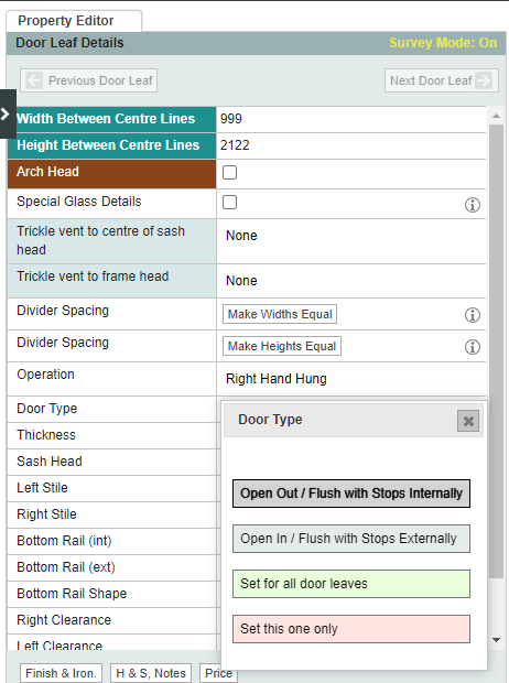 To change whether the door opens inwards or outwards, select the door leaf, then click the required option next to the door type. After choosing an option, apply the changes to the selected leaf only, or all the door leaves in the drawing.