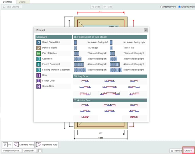 To change a door type, for example, from a single door to a pair of French doors or a stable door, select the door leaf, click change in the bottom right of the screen, then choose the relevant option.