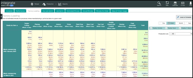 When the factory loading report is first opened it will show an overview of each process within the production line, outlining the estimated minutes of production yet to be completed.