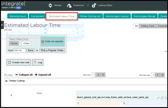 Estimated minutes are calculated for the system from the estimated labour time page. From the integrate home page, navigate to integratePRO, select lookup editor in the production list, then select the estimated time labour tab.