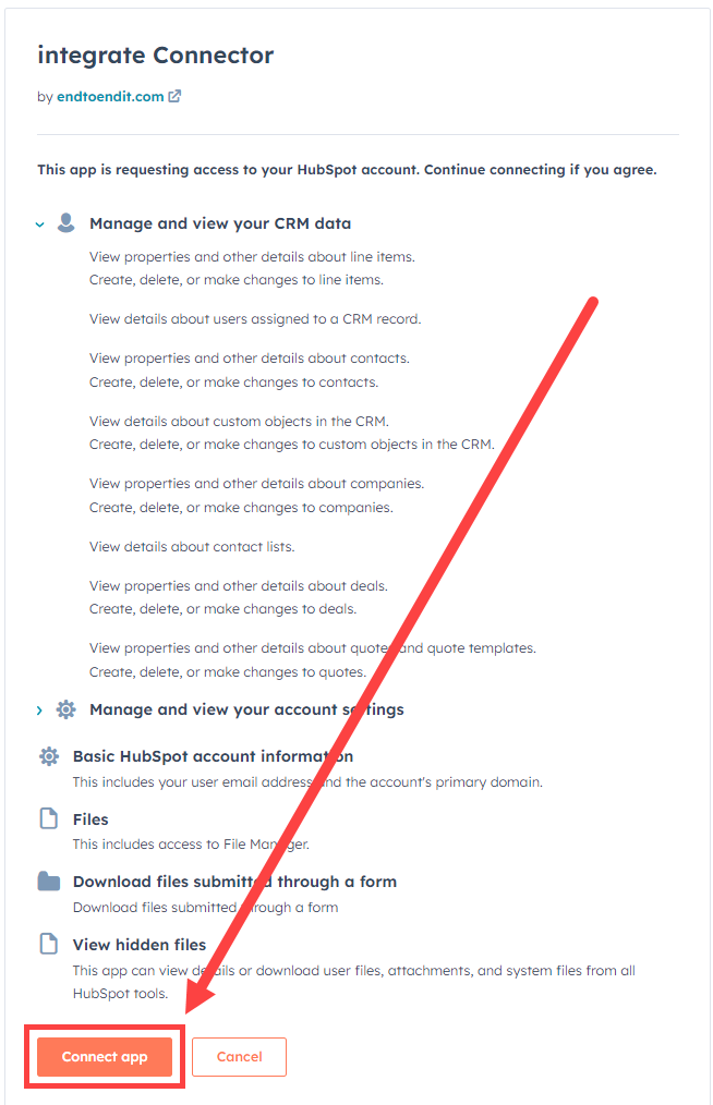 Once logged in and desired HubSpot account selected, click the connect app button. The system will complete the connection to integrate.