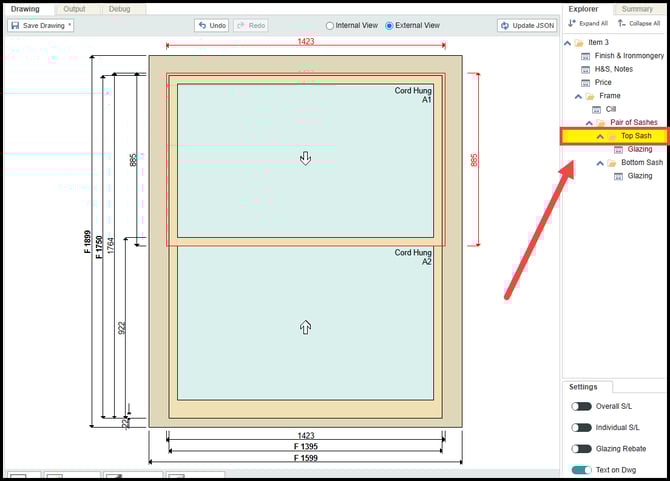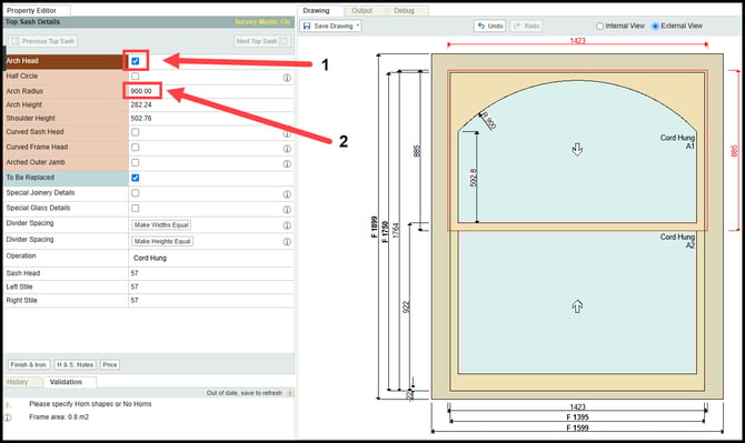 With the top sash selected, navigate to property editor, on the left hand side of the screen. Select the arch head option and set an arch radius, for example, 900mm.