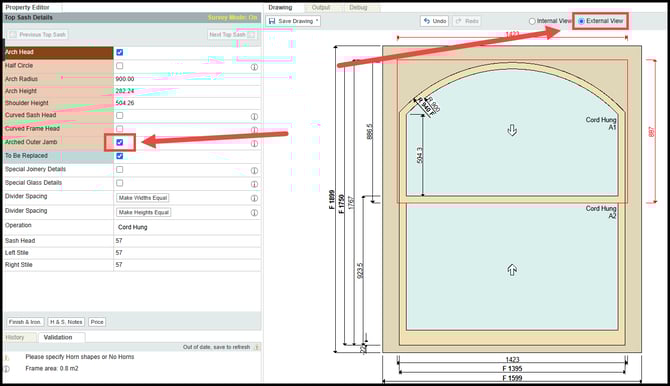 With external view selected, tick the box arched outer jamb.