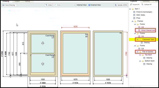 Depending on item type, click on pair of sashes, casement sash or direct glazed unit.