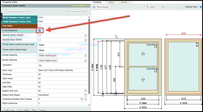 Under the property editor, on the left-hand side, untick to be replaced tick box, to remove the sash from the frame leaving the frame only.