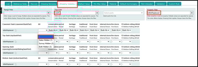 Navigate to the property visibility tab. Under the part filter search for sash. Under the property filter search to be replaced.