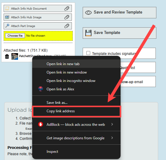 When the image appears in the attached files list, hover over its name and select copy link address.