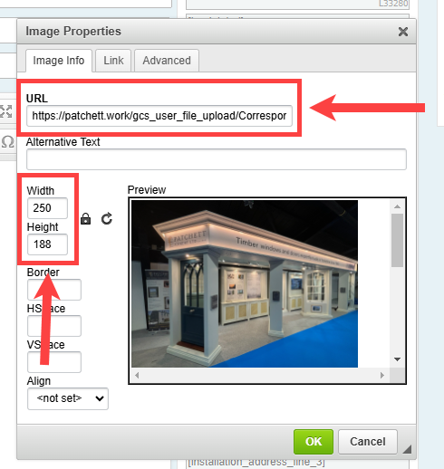 Paste the copied link into the URL field. Click OK to embed your image within the template.