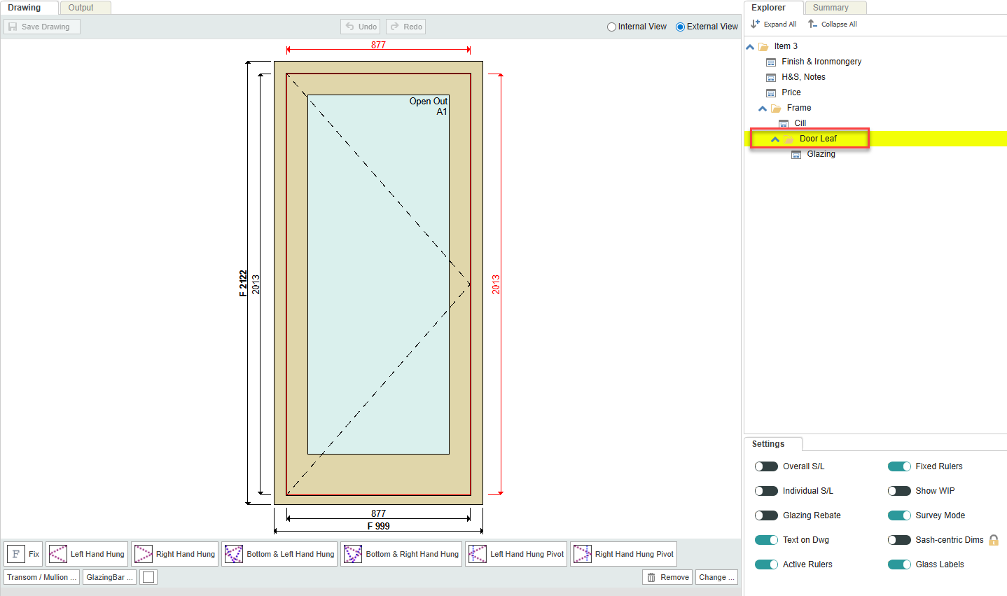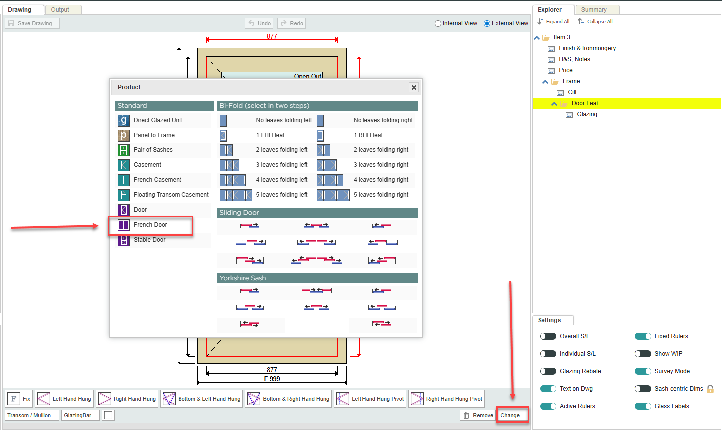 On the DrawingBoard, click the Door Leaf (or whatever sash you want to convert to a French Door) within the explorer on the right-hand side of the screen, or click it on the drawing.