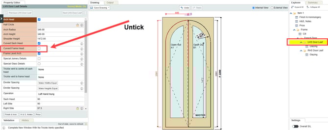 Untick the curved frame head option to leave curved sash head and frame level arch options active.