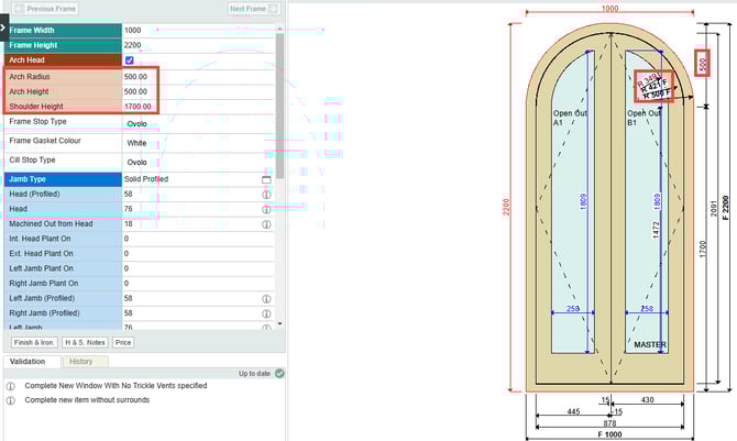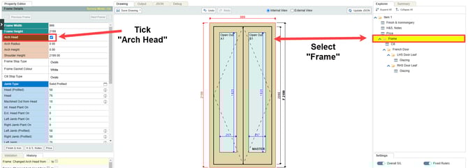 Click on the frame in the drawing, or using the explorer select the frame and access the property editor. Tick the arch head option to view arch radius, arch height, and shoulder height properties.
