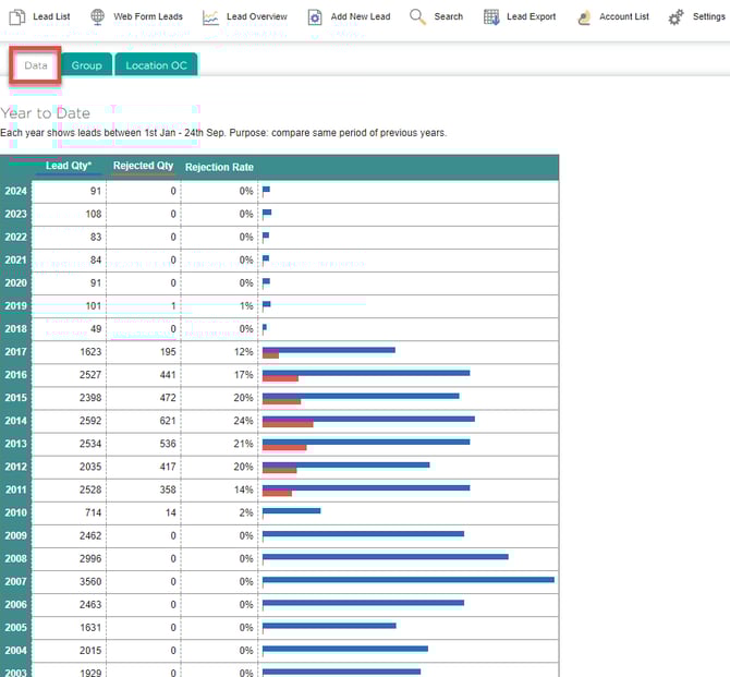 Click the data tab to see the number of leads per year, and the number of rejected leads.