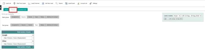 Click the group tab to view leads according to assigned salesperson, sector, or status. See two categories at once by setting a main group with a different sub-group (for example, how many quoted leads (status) are for domestic enquiries (sector) this month (set using data range on the right).