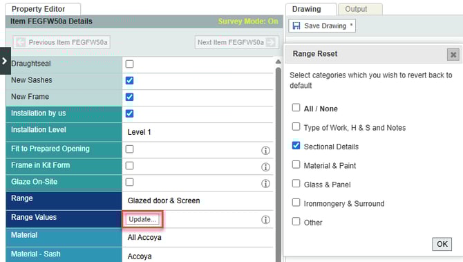 Door midrails can have a different default width from other rails. Tick the is midrail box to designate a particular rail as the midrail. Switch range or click update to reapply the defaults for the current range. Select the sectional details category.