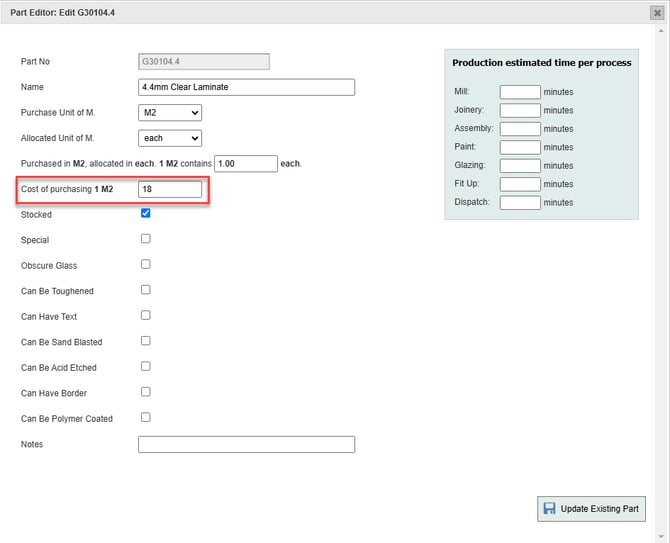 Cost Plus takes a granular approach to calculate the cost of each window based on material costs, production labour, and installation, then adds a markup to that cost to work out the price. Cost Plus pulls values from other parts of the system, such as, production hours from the estimated labour time page and ironmongery costs from the Part List, then feeds them into the calculation.