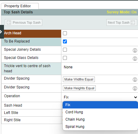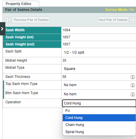 To change between weights, pulleys and spiral hung, select pair of sashes, then select the operation type.