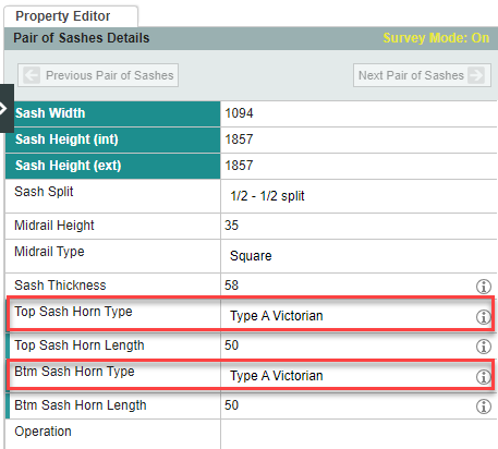 To add a sash horn, select pair of sashes, then choose a horn design for top sash horn type and/or btm sash horn type.