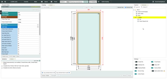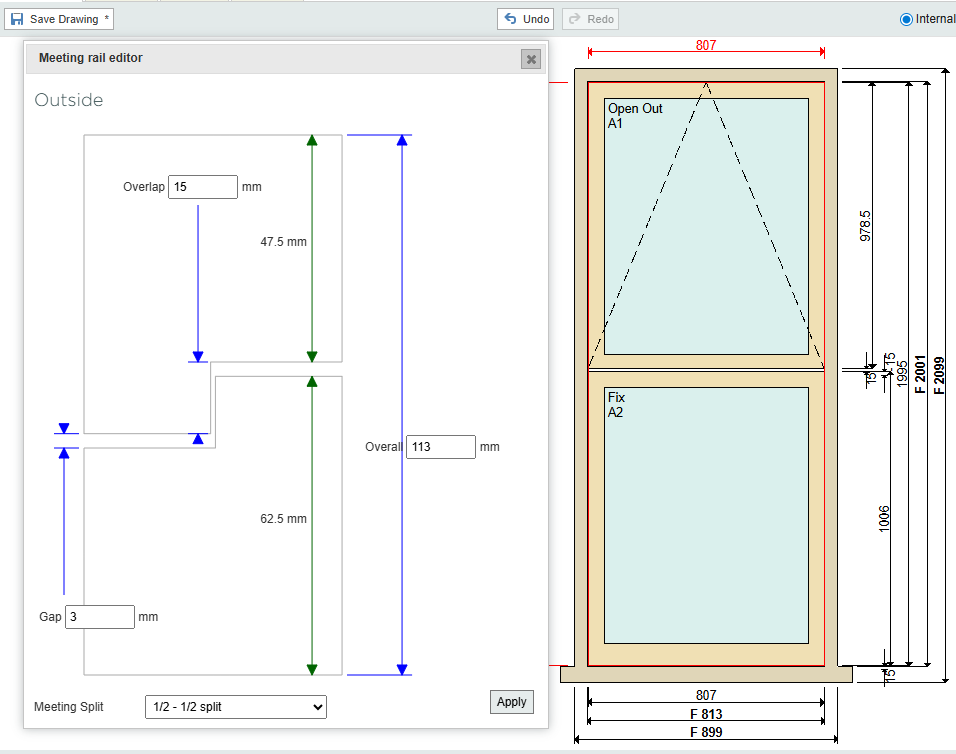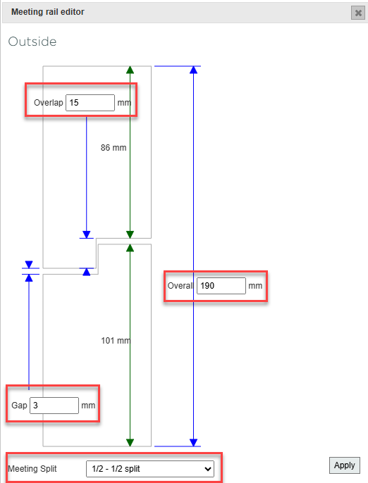 In the property editor, change the overlap, gap and overall size of the meeting rail. Enter the desired values into the property boxes. If you don't want a 1/2 - 1/2 split, you can edit the values on the green arrows individually by selecting a different Meeting Split. Once satisfied with the measurements, click apply in the bottom right of the meeting rail editor.