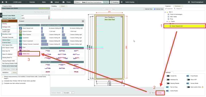 Select the interior of the door, click the change button on the bottom right. Select the stable door option from the product type selector menu.