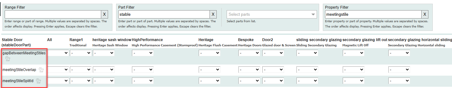 From the visibility tab, select part filter, then stableDoorPart. Under property filter, search for meetingStile.