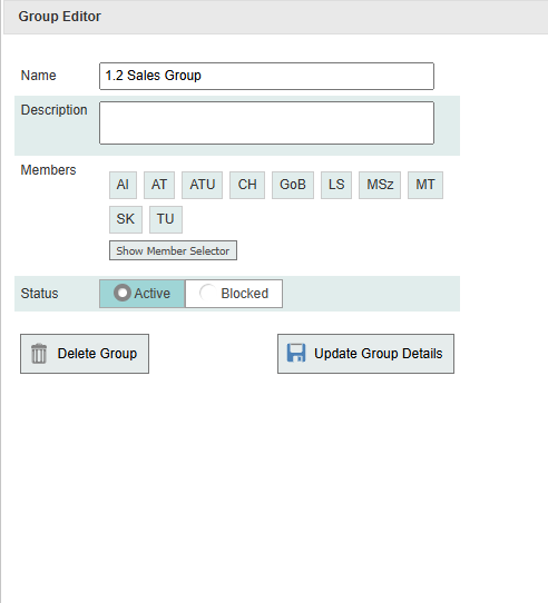 To edit the group name, add a description or remove existing members click the cross next to the user's name. To add a member, click show member selector to see a full list of users. Status can be changed to blocked to turn off a group's access, or delete it entirely.