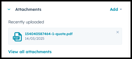 After publishing a quote and generating the quote PDF, integrate automatically transfers the document to HubSpot. It can be found in the attachments section of the corresponding HubSpot deal.