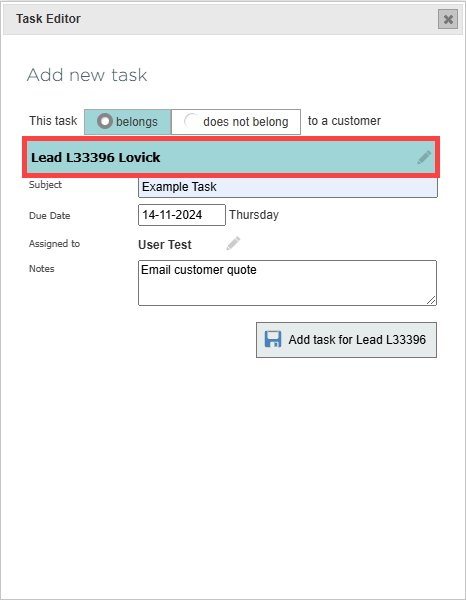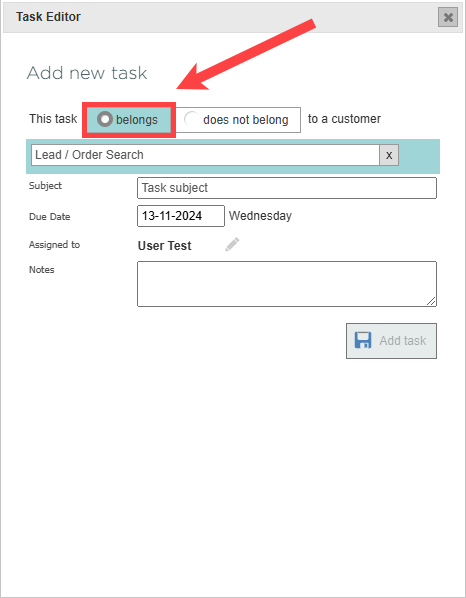 In the belongs field, select this task belongs to a customer. A search bar appears. Type to find and select the correct lead or order.