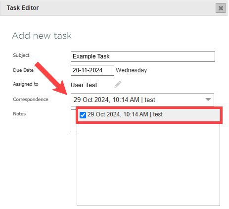 When accessing the task editor through the correspondence tab, an additional correspondence field appears. In the dropdown list, choose an email already stored under the record’s correspondence tab to attach to an order or task. Associated emails can be viewed from the tasks tab.