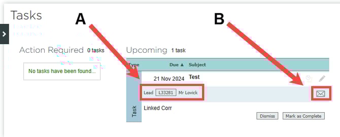 Lead/order link (A) – Shows the lead or order number and the customer name. Clicking the number opens the correspondence tab of that record