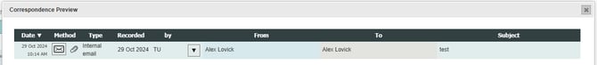 Email link (B) – Clicking the small email icon opens a correspondence preview of the linked email